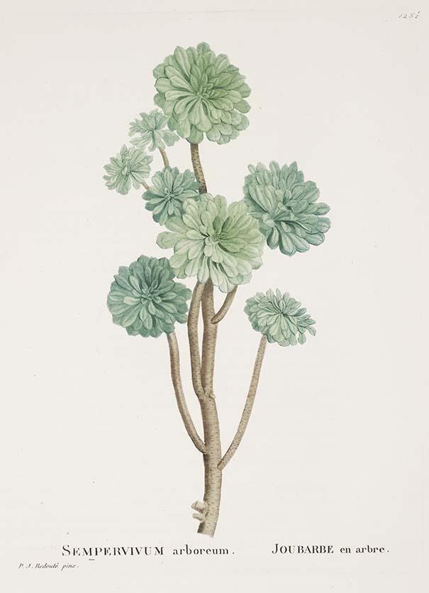Aparece ilustrado en las diferentes versiones árabes de la Materia medica de Dioscórides, médico griego que vivió en el siglo I d.C. cuya obra, en cinco volúmenes, versa “sobre la preparación, propiedades y pruebas de drogas”. Texto de gran relevancia para el desarrollo de la farmacopea moderna, que describe unas 600 plantas medicinales incluyendo el aeonio, su primera traducción satisfactoria al árabe se realizó en la Córdoba del califa Omeya Abderramán III; durante este tiempo se produjo una auténtica revolución verde en el sur de la Península Ibérica que se basó en parte en el conocimiento de las propiedades de las plantas, tanto a nivel médico como a nivel botánico.
