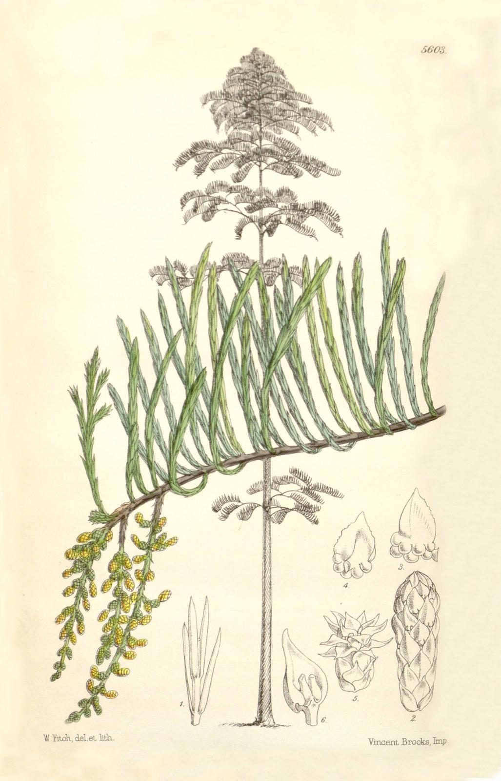 El nombre genérico deriva de taxus, “tejo”, y eidos, “parecido”, refiriéndose al aspecto similar que presenta su follaje con esta especie. También presenta las raíces aéreas características del género.Procedencia