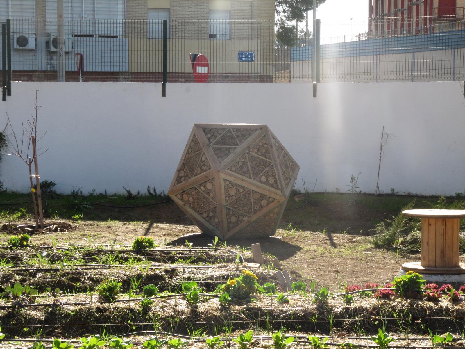Una tarde ya finalizada la exposición de Luces de barrio en la casa Murillo y comenzado el 2018, Javier Real (nuestro carpintero), Tamara y yo volvimos a montar el hotel de insectos con forma de icosaedro en el huerto del colegio Andalucía en el Polígono Sur.