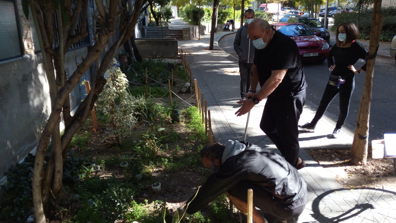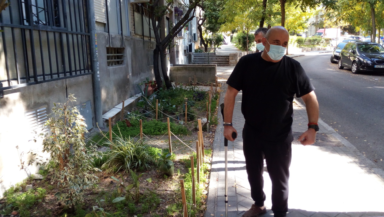 Del número 86 de la calle de Badalona apareció Dionisio apoyado en una muleta mientras fotografiamos los dos parterres ajardinados situados frente a su casa.